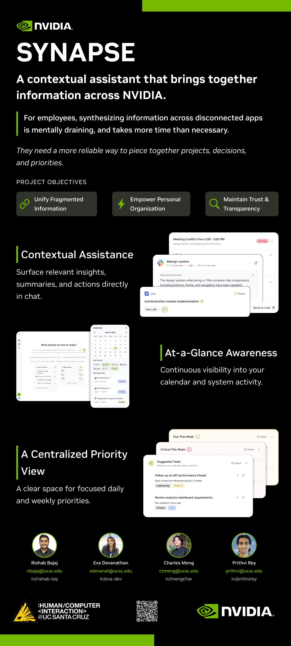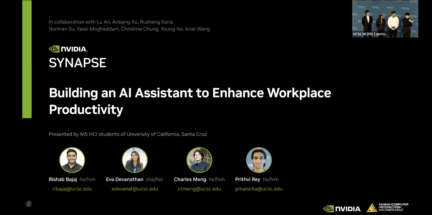 From Spring to Fall, we spoke with real NVIDIA employees, consulted mentors, advisors, and colleagues, designed a solution from 0 - 1, created a poster and a video, and finally presented everything to our cohort and other industry professionals.